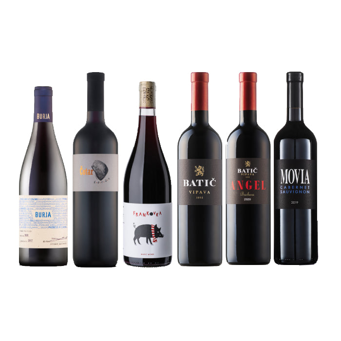 Einzigartige rote Naturweine aus Slowenien in einem Paket vereint. Entdecken Sie die Winzerkunst unserer slowenischen Naturwein-Weingüter. Batic und Burja aus dem Vipava Tal, Vina Cotar aus dem slowenischen Karstgebiet, Matic Wines aus der slowenischen Steiermark und MOVIA aus dem Goriska Brda. Weine von hervorragender Qualität, biodynamisch mit höchster Achtung vor der Natur hergestellt, kleinste Erträge, tief verwurzelt in der slowenischen Weinkultur. Internationale Rotwein-Sorten wie Cabernet Franc, Cabernet Sauvignon, Pinot Noir, Blaufränkisch und Barbera vereint mit der regionalen Spezialität des slowenischen Karstgebietes dem Teran.